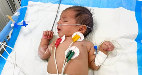 In Khan Yunis, south of the Gaza Strip, infant Rahaf lies in her bed in the intensive care unit at Nasser Medical Complex, connected to a ventilator. She is suffering from an undiagnosed virus and difficulty breathing.