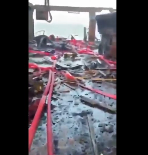 Scenes documenting destruction inside a ship in the Gulf of Aden targeted by a missile